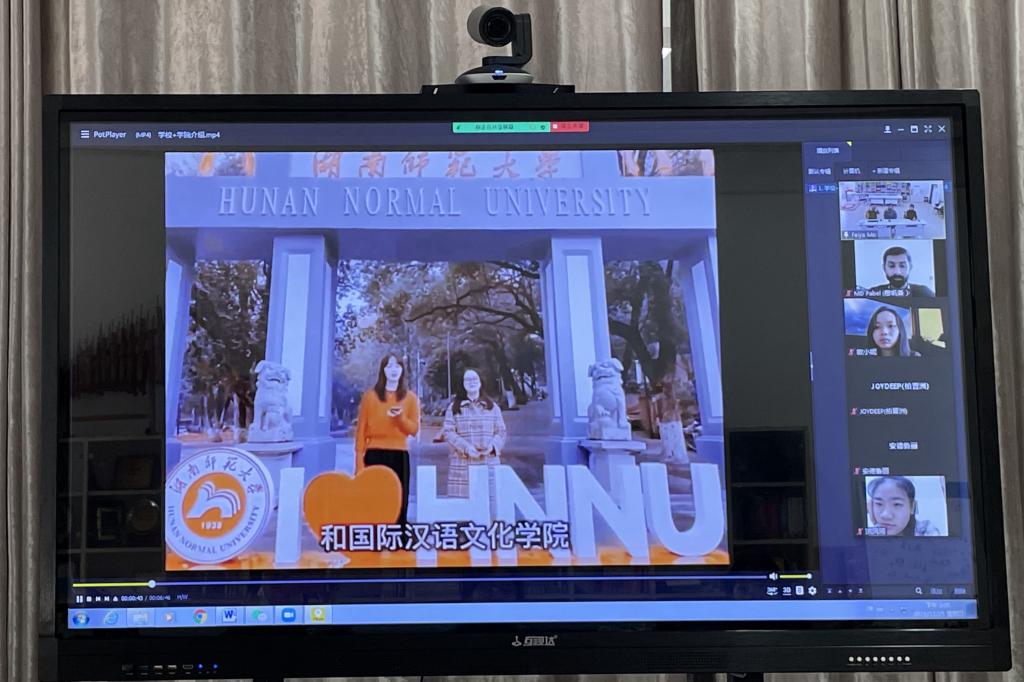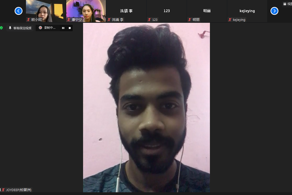 在自由交流环节,同学们畅所欲言。来自孟加拉的语言进修生柏晋洲表示,观看视频后,他更加迫切地想要来到中国来到美丽的校园;正值感恩节,他还对公司老师们的辛勤付出表示衷心的感谢。于当地时间已是凌晨1点的厄瓜多尔的安德丽,依旧兴致勃勃地参与活动,并表达出她对公司美景的喜爱和对在校时光的怀念,希望能早日重返校园。