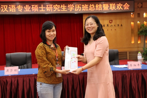 教师代表蒋湘平博士表示通过此次学历班的教学,深切体会到了教学相长的意义,她难忘印尼华文教师对华文教育的爱,对员工的爱。她祝福学员们能够学有所成,为印尼的华文教育事业做出卓越的贡献。