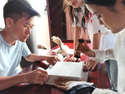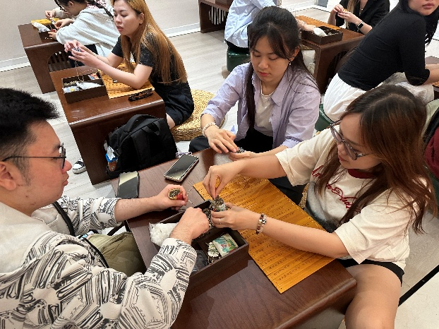 随后,国际员工们来到汨罗江畔的端午习俗体验馆,围坐一起,亲手制作艾草香囊。一些初次拿针缝物的同学,小心翼翼引线,动作生涩却专注。大家相互帮忙、交流技巧,最后都成功完成了自己的作品。艾草香囊承载古人驱虫祈福之意,此次体验让同学们感受到了中国传统工艺的精巧,体悟了民俗文化的内涵。