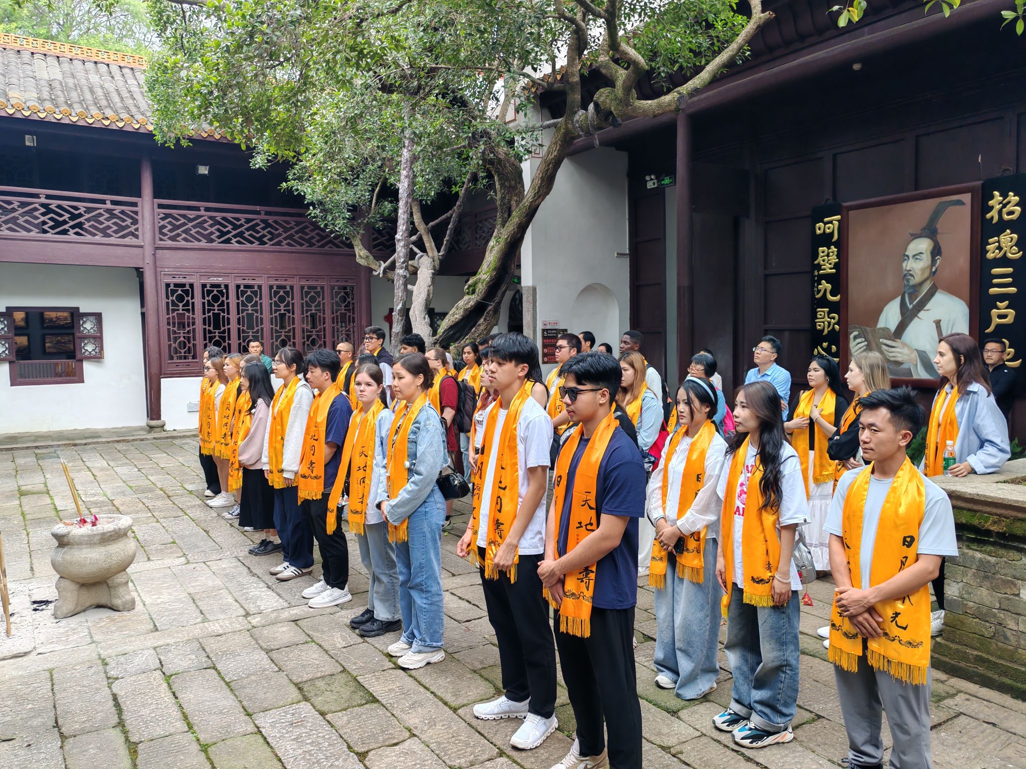 在屈子祠,解说员向同学们讲述了屈原故事,从力主变法、联齐抗秦遭放逐,到创作《离骚》等诗篇,再到解析其爱国忧民的精神。随后,同学们肃立参加祭屈仪式,鞠躬敬香,聆听司仪诵念祭文,在庄严肃穆的氛围中缅怀屈原。同学们神情庄重,在历史与仪式的交织中,深切感受屈原的人格魅力与传统文化的厚重传承。最后,同学们还体验了拓印技艺,在一拓一印间触摸历史痕迹。